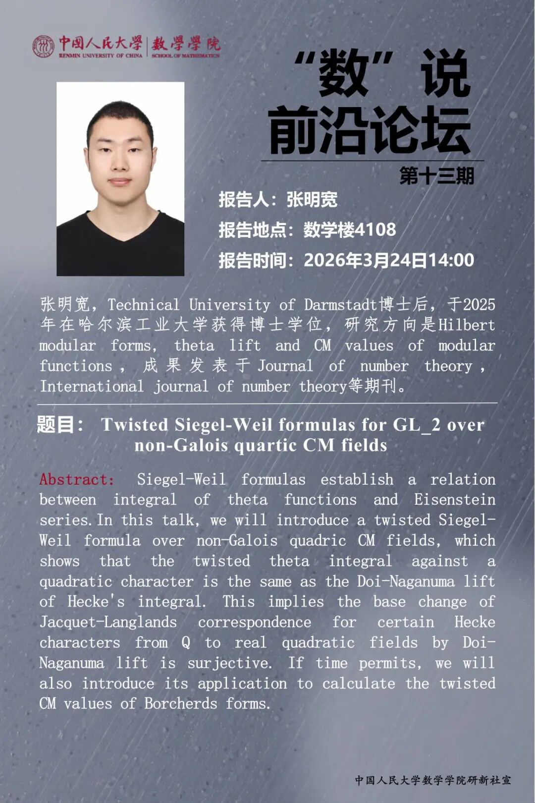 Zhang Mingkuan is a postdoctoral researcher at the Technical University of Darmstadt. He obtained his Ph.D. from Harbin Institute of Technology in 2025. His research interests include Hilbert modular forms, theta lifts, and CM values of modular functions. His work has been published in journals such as Journal of Number Theory and International Journal of Number Theory.