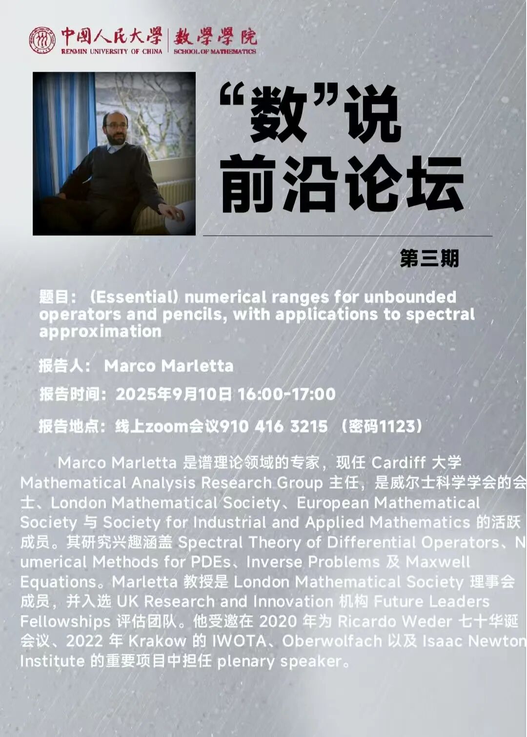 Marco Marletta is an expert in spectral theory and currently serves as the Head of the Mathematical Analysis Research Group at Cardiff University. He is a Fellow of the Learned Society of Wales and an active member of the London Mathematical Society, the European Mathematical Society, and the Society for Industrial and Applied Mathematics. His research interests include the spectral theory of differential operators, numerical methods for PDEs, inverse problems, and Maxwell’s equations. Professor Marletta is a member of the Council of the London Mathematical Society and has been selected to serve on the Future Leaders Fellowships review panel of UK Research and Innovation. He has been invited as a plenary speaker at significant events, including the Ricardo Weder 70th Birthday Conference (2020), IWOTA 2022 in Krakow, Oberwolfach, and major programs at the Isaac Newton Institute.