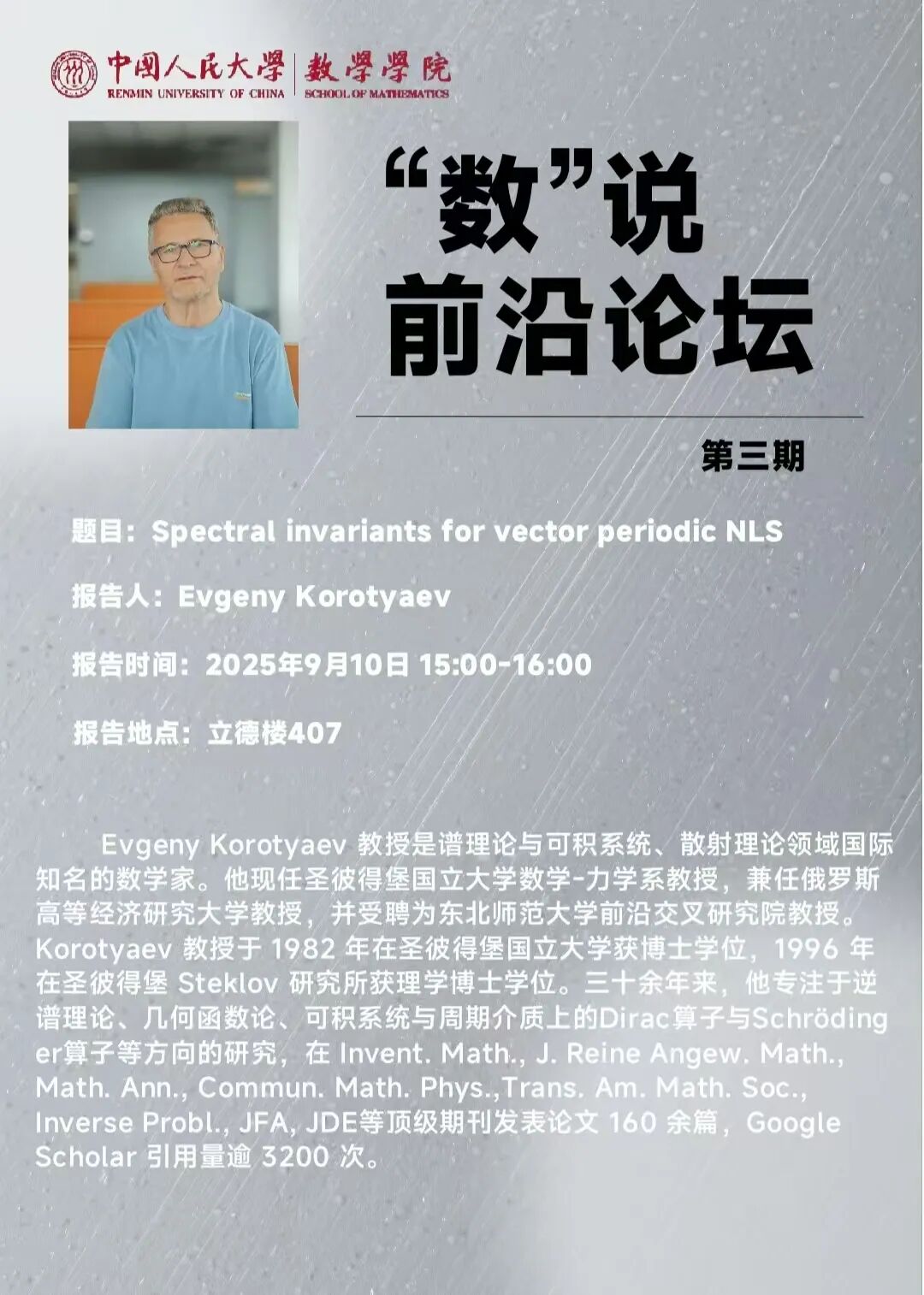 Professor Evgeny Korotyaev is an internationally renowned mathematician in the fields of spectral theory, integrable systems, and scattering theory. He is currently a Professor in the Department of Mathematics and Mechanics at Saint Petersburg State University, a Professor at the Higher School of Economics in Russia, and a Professor at the Institute of Frontier Interdisciplinary Research, Northeast Normal University. Professor Korotyaev received his Ph.D. from Saint Petersburg State University in 1982 and a Doctor of Science degree from the Steklov Institute of Mathematics, Saint Petersburg, in 1996. Over the past thirty years, he has focused on research in inverse spectral theory, geometric function theory, integrable systems, and Dirac and Schrödinger operators on periodic media. He has published over 160 papers in top journals such as Inventiones Mathematicae, Journal für die reine und angewandte Mathematik, Mathematische Annalen, Communications in Mathematical Physics, Transactions of the American Mathematical Society, Inverse Problems, Journal of Functional Analysis, and Journal of Differential Equations, with more than 3,200 citations on Google Scholar.