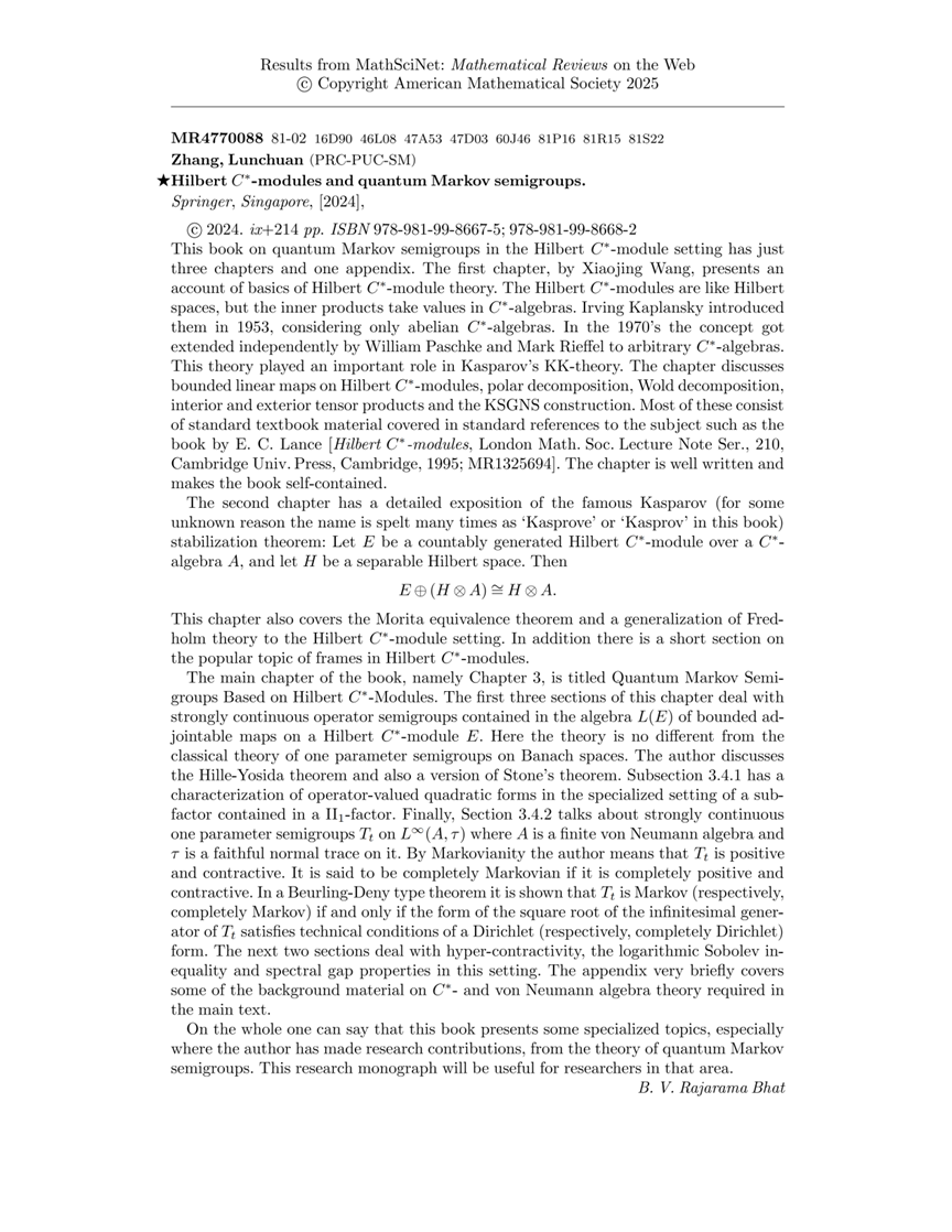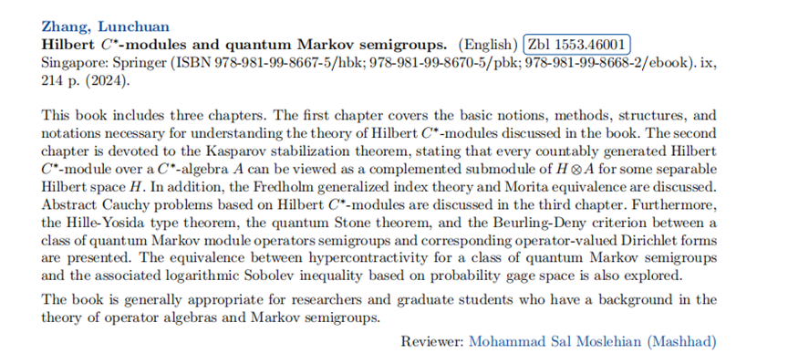 Recently, the English monograph Hilbert C*-Modules and Quantum Markov Semigroups, authored by Professor Zhang Lunzhuan from the School of Mathematics, has attracted wide interest from the global academic community for its contributions to quantum probability. Published by the internationally renowned academic publisher Springer in 2024, the book has received recognition worldwide for its academic value.